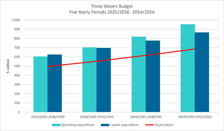$ million 2025/26 2026/27 2027/28 2028/29 2029/30 2030/31 2031/32 2032/33 2033/34 2034/35 Total Operating expenditure $65.7 $69.9 $72.9 $77.2 $85.9 $91.6 $96.6 $101.7 $107.5 $109.8 $878.9 Depreciation $62.0 $62.9 $66.3 $70.0 $74.1 $78.7 $82.8 $86.8 $90.8 $92.8 $767.2 Total operating expenditure $127.7 $132.8 $139.2 $147.3 $160.0 $170.3 $179.4 $188.5 $198.2 $202.6 $1,646.0 Renewals $49.5 $50.3 $35.6 $28.5 $34.6 $49.6 $44.1 $65.5 $102.4 $116.7 $576.6 Level of service $24.9 $30.5 $41.7 $65.0 $68.3 $57.9 $56.9 $52.4 $37.7 $67.2 $502.6 Growth $12.8 $11.3 $13.5 $13.2 $15.8 $14.3 $13.7 $17.9 $22.0 $5.1 $139.7 Total capital expenditure $87.1 $92.1 $90.8 $106.7 $118.7 $121.9 $114.7 $135.8 $162.1 $189.0 $1,218.9 5.2 Three waters 30 year budget