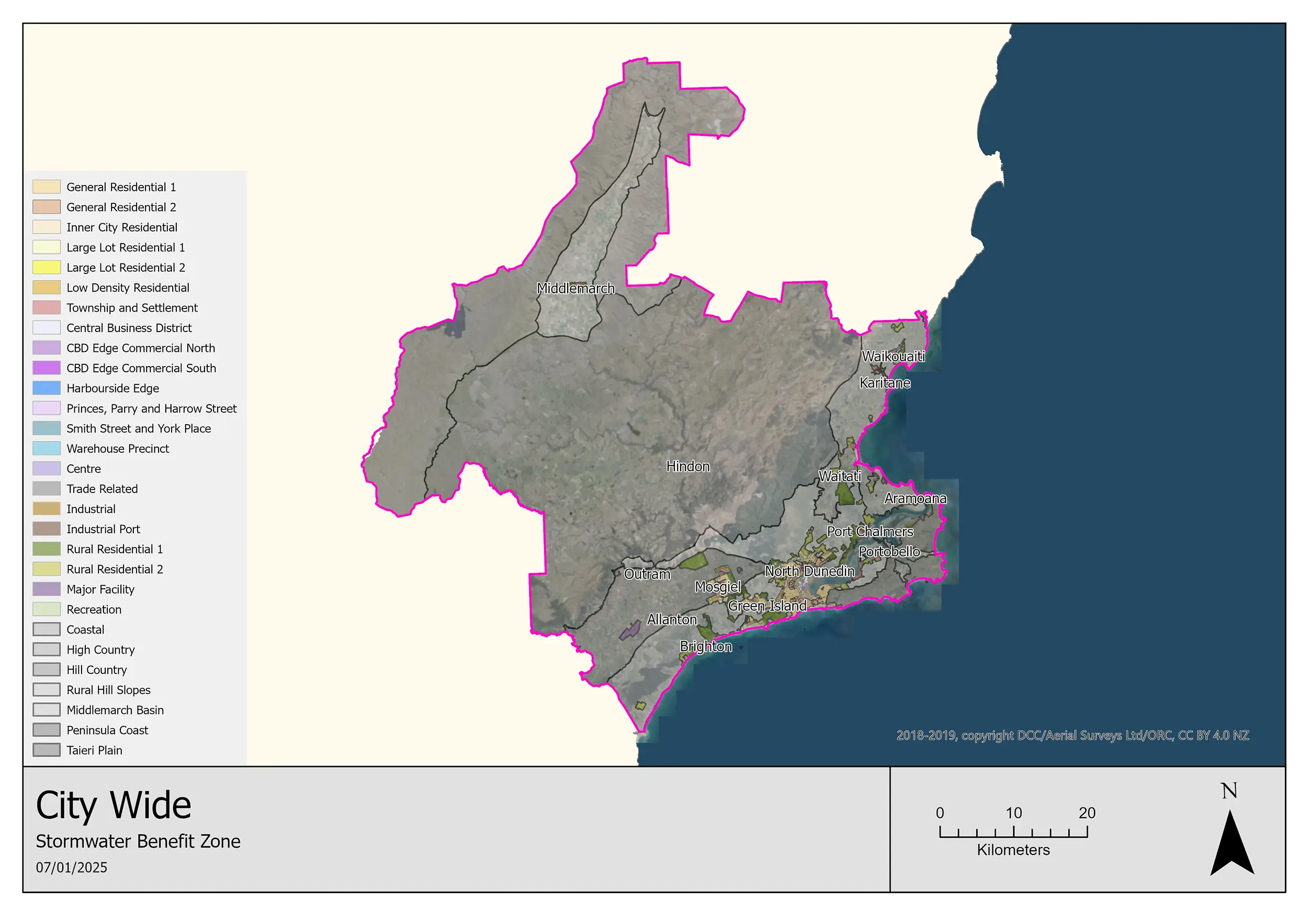 Stormwater has a single city-wide area of benefit however it has been determined that this charge will not apply in the Allanton, Karitane, Merton, Middlemarch, Outram, Rockland Rural, Seacliff, Warrington, Waitati and West