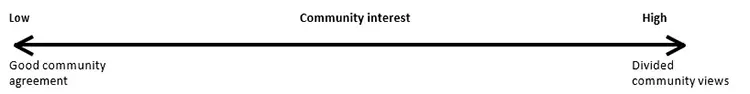 - Community interest: The extent to which individuals, organisations, businesses, groups, communities and sectors within the community are particularly affected by, or are interested in, the matter. Factors to be considered include: