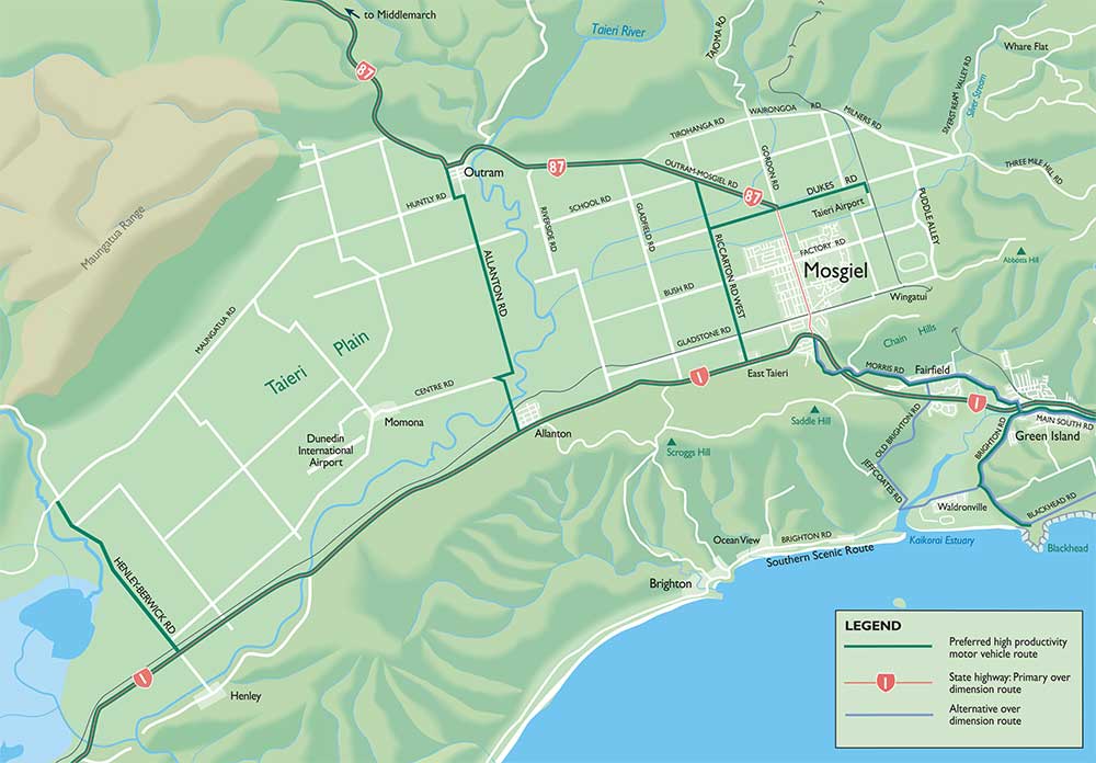 Figure 22a. Preferred High Productivity Motor Vehicle and over-dimension routes - Southern and Taieri