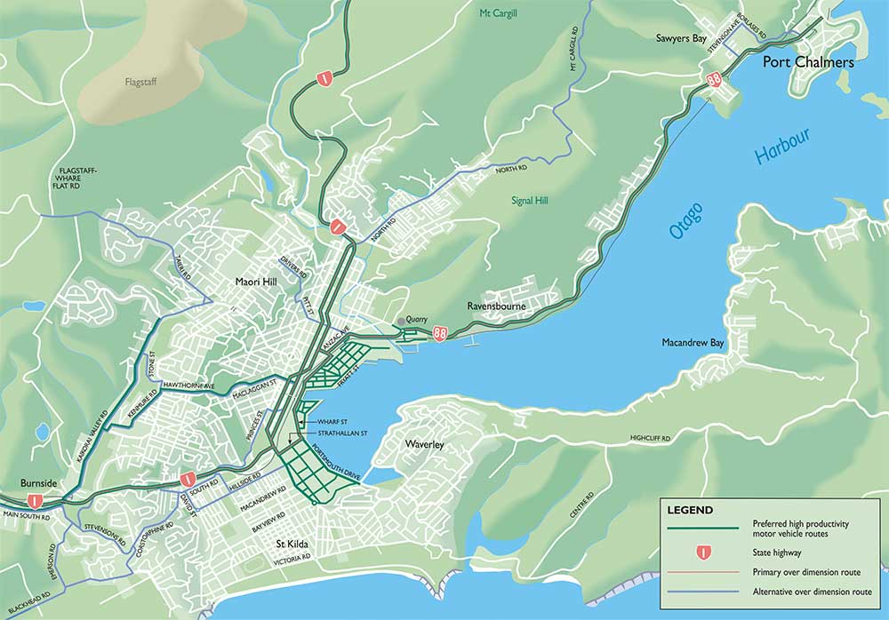 Rising fuel costs, increasing pressure for greater efficiencies across the transport sector and a central Government focus on economic growth and productivity have all been key drivers of the move to provide for these larger vehicles and the NZTA is supporting this direction through its ‘more freight on fewer trucks’ approach55. Dunedin can expect to see an increase in the number of HPMVs using the road network in the coming years.