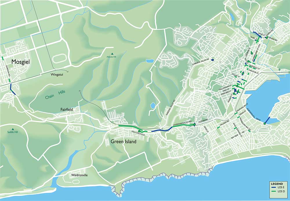 Figure 23. Projected levels of service (areas of congestion) on Dunedin's network in 2014.
