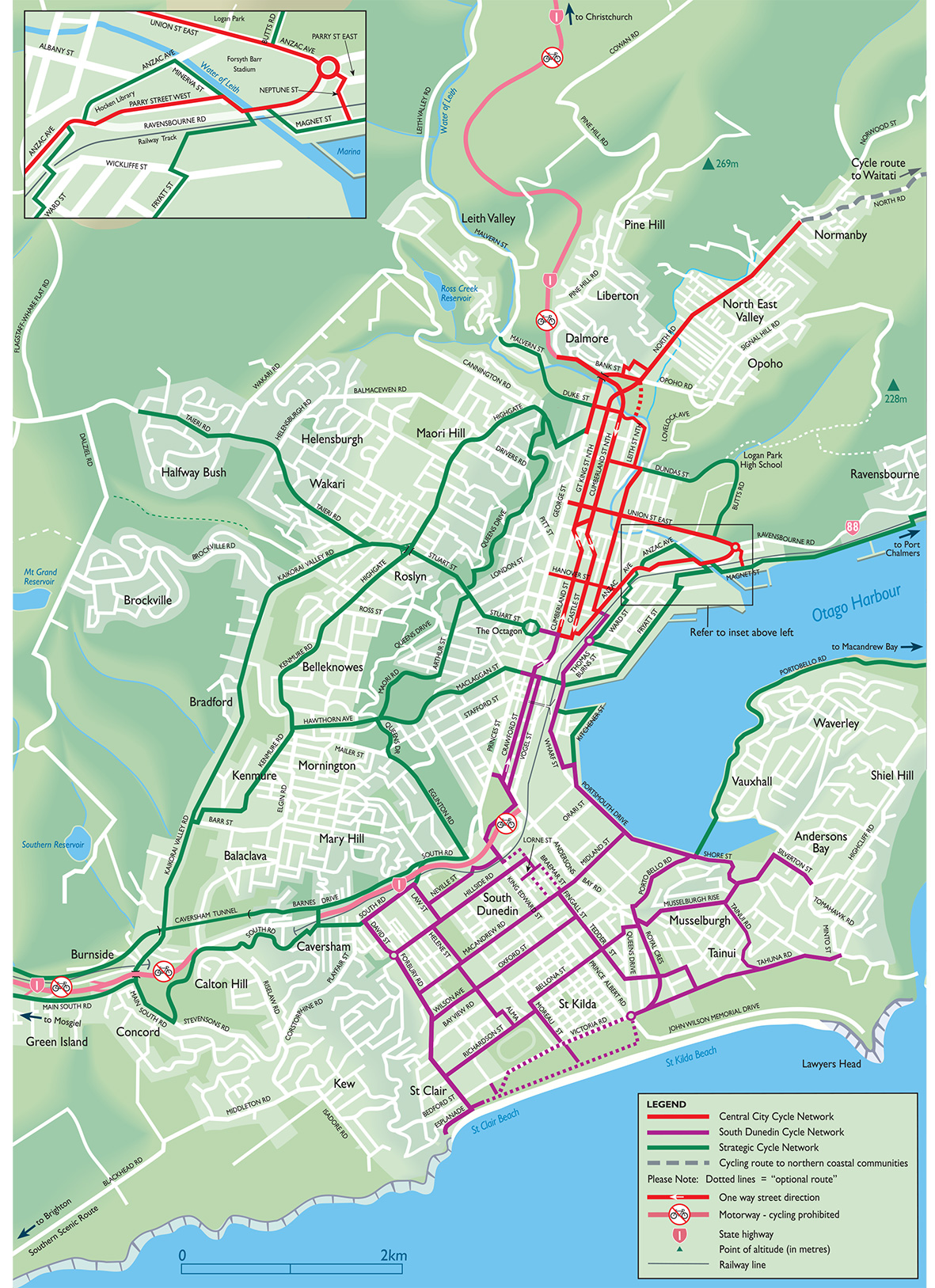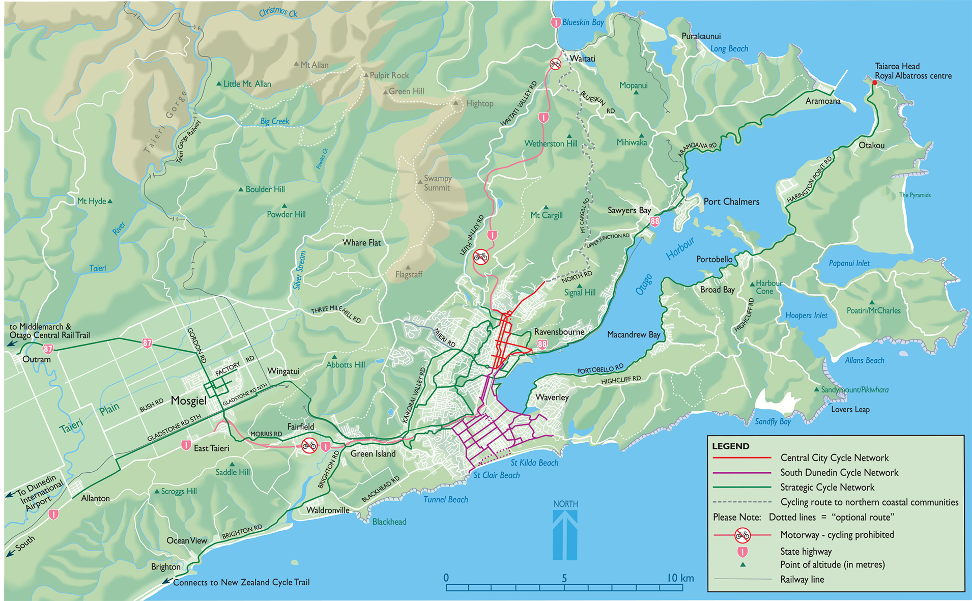 In 2011, the Council adopted a Strategic Cycle Network (SCN) for Dunedin Citywide (see Figure 16). The SCN sets out the priority routes for cycling and the key links between destinations for users, identified through consultation and engineering assessments and will guide the DCC in selecting routes for cycle facilities40. Through the SCN the DCC aims to create safe, user-friendly cycling links between centres, and from centres to the central city.