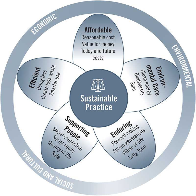 The DCC has also established a set of five sustainable development principles. These work together to guide decision making, ensuring that Dunedin becomes increasingly sustainable. These principles are shown in the DCC’s Sustainable Practice model 6.