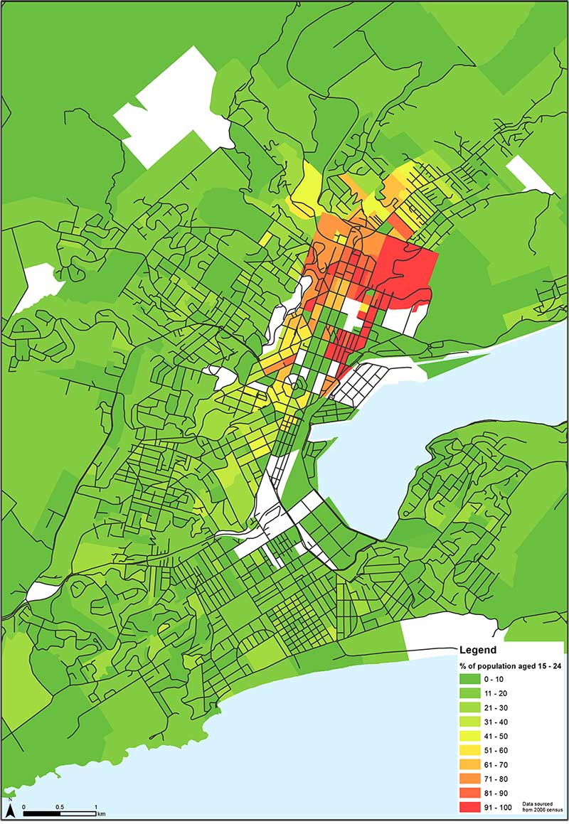 Figure 10. The areas of central urban Dunedin with the highest proportion of residents aged between 15 and 24 years.