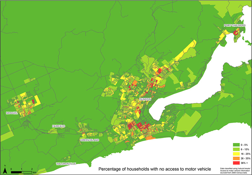 Figure 11. Percentage of households with no access to a motor vehicle (fuller maps available at www.dunedin.govt.nz/annual-plan).