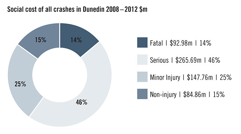 In Dunedin, fatal and serious injury crashes make up approximately 60% ($348 million) of the total social cost, even though they only account for approximately 7% of the total number of crashes. This is because the social cost of deaths and serious injuries is much higher than for minor or non-injury crashes. In the 12 months to May 2013, Dunedin’s fatal and serious injury crashes cost approximately $75 million. For many serious injury crashes, the costs are on-going as they result in long-term healthcare needs. This cost is higher still when the casualty is a young person who may need on-going support and health care for the rest of their lives.