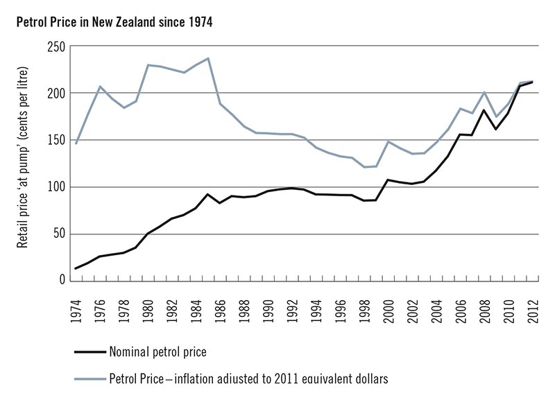 Figure 4. The price of petrol in New Zealand has been increasing for several decades, and most dramatically since 2000.