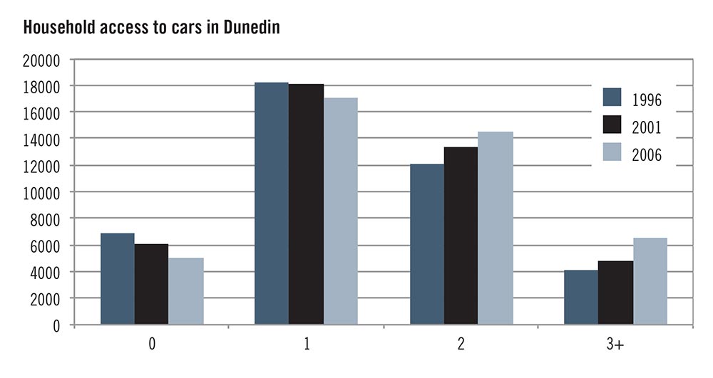 Not only does Dunedin have a high rate of car use but Dunedin households have increasingly had access to more cars over the past 15 years (as illustrated in Figure 7). Over the ten years from 1996 to 2006, the number of households that did not have access to a car decreased from 6897 to 5007. Similarly, the number of households with only one car decreased over this decade as more households acquired two or three (or more) cars.