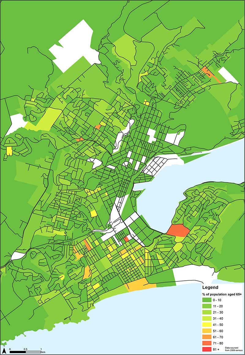 Figure 9. The areas of central urban Dunedin with the highest proportion of residents aged 65 and over.