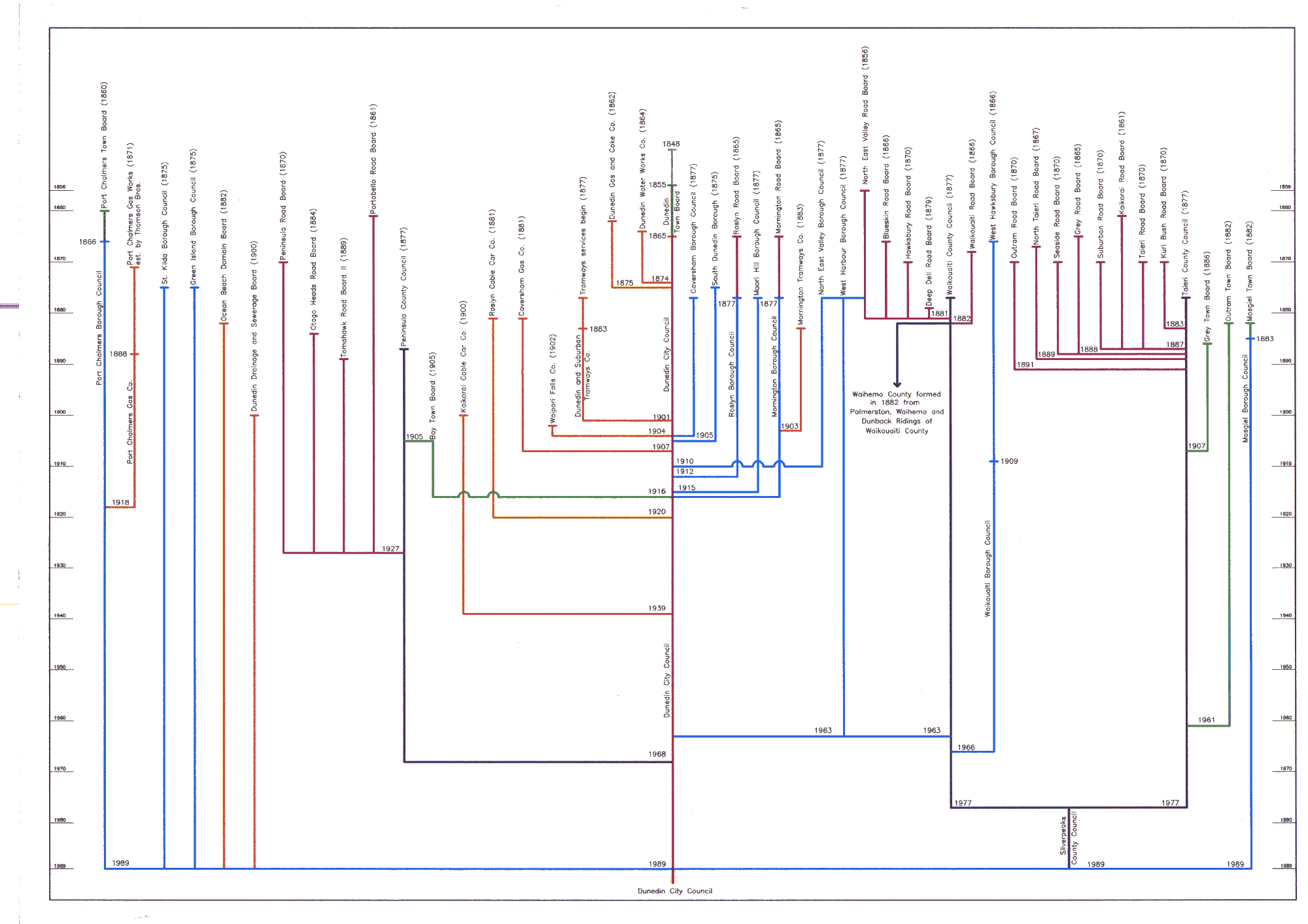 This family tree maps how DCC’s predecessor’s merged into other authorities and then DCC over time. The last major merge was the 1989 Local Government Reorganisation Act which created the current Dunedin City Council.