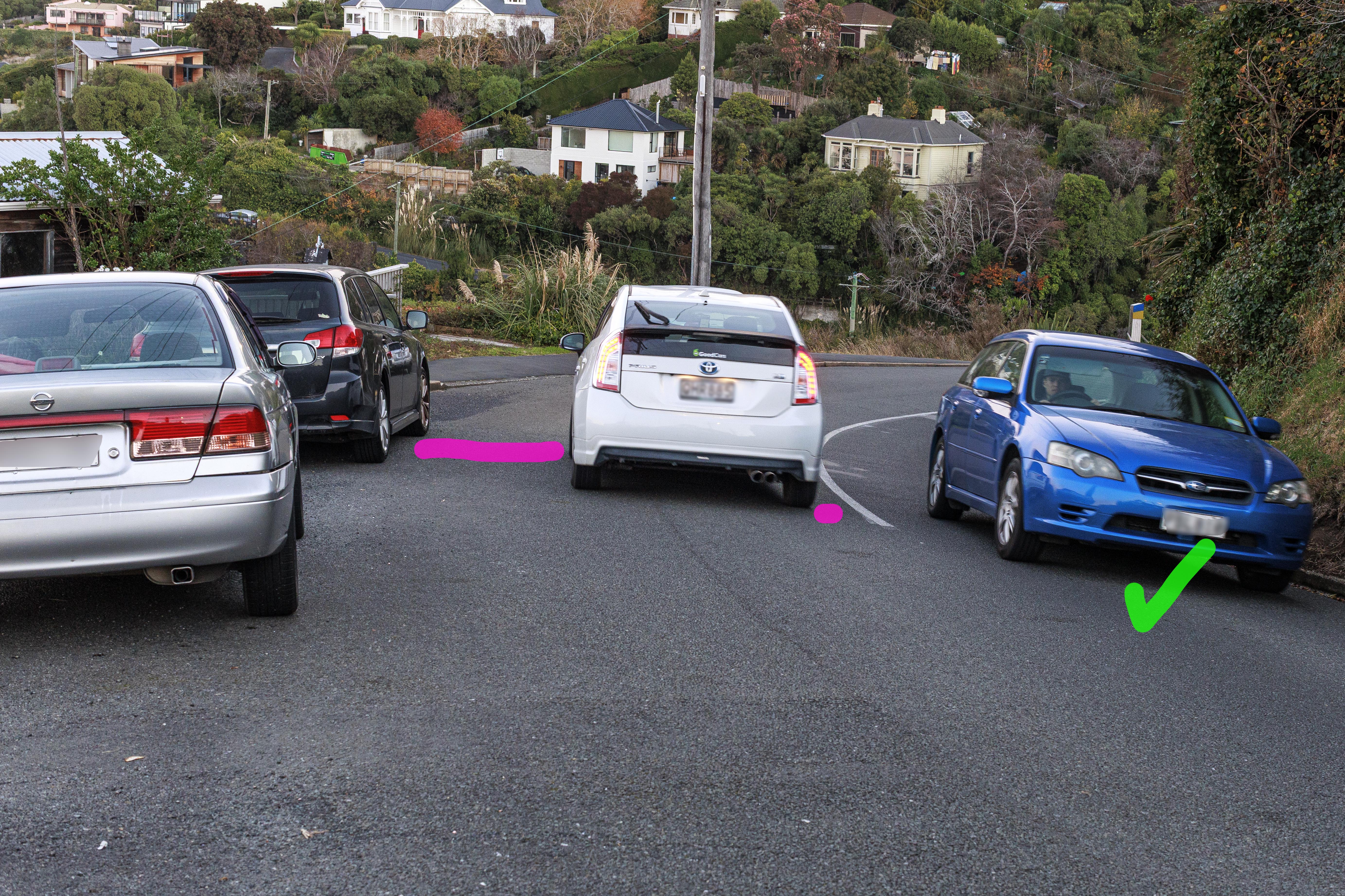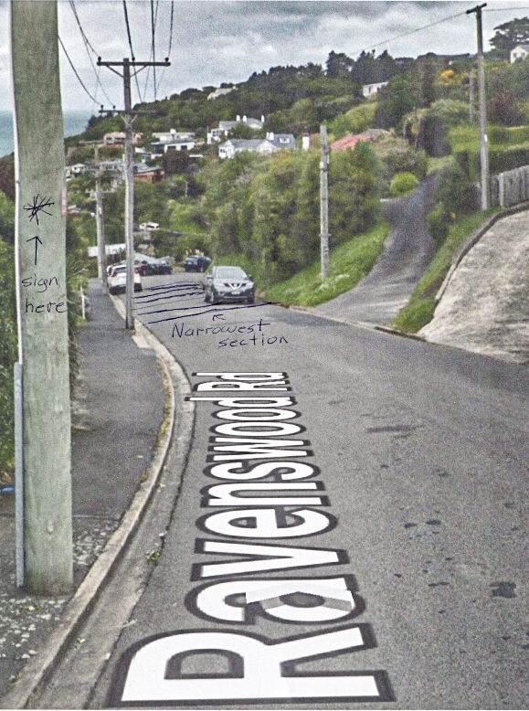 Since a roading engineer accepted my husband’s proposal to have to centre line realigned a number of years back, followed by an arrangement to have the plant growth on the bank regularly trimmed, the corner in the area of 115/121 has become a safe corner with vehicles no longer driving wide to gain visibility. The only problem that occurs occasionally is caused by downhill vehicles travelling to fast causing them get close to (and sometimes cross) the centre line outside 121 Ravenswood (see jpg attached). This could be resolved by reducing the speed of traffic. There is still plenty of space on their left. The yellow broken lines wont help this problem.