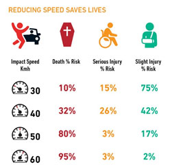 Lower speed limits around schools mean more time to react and avoid crashes. They also reduce the risk of serious injury and death when crashes do occur.